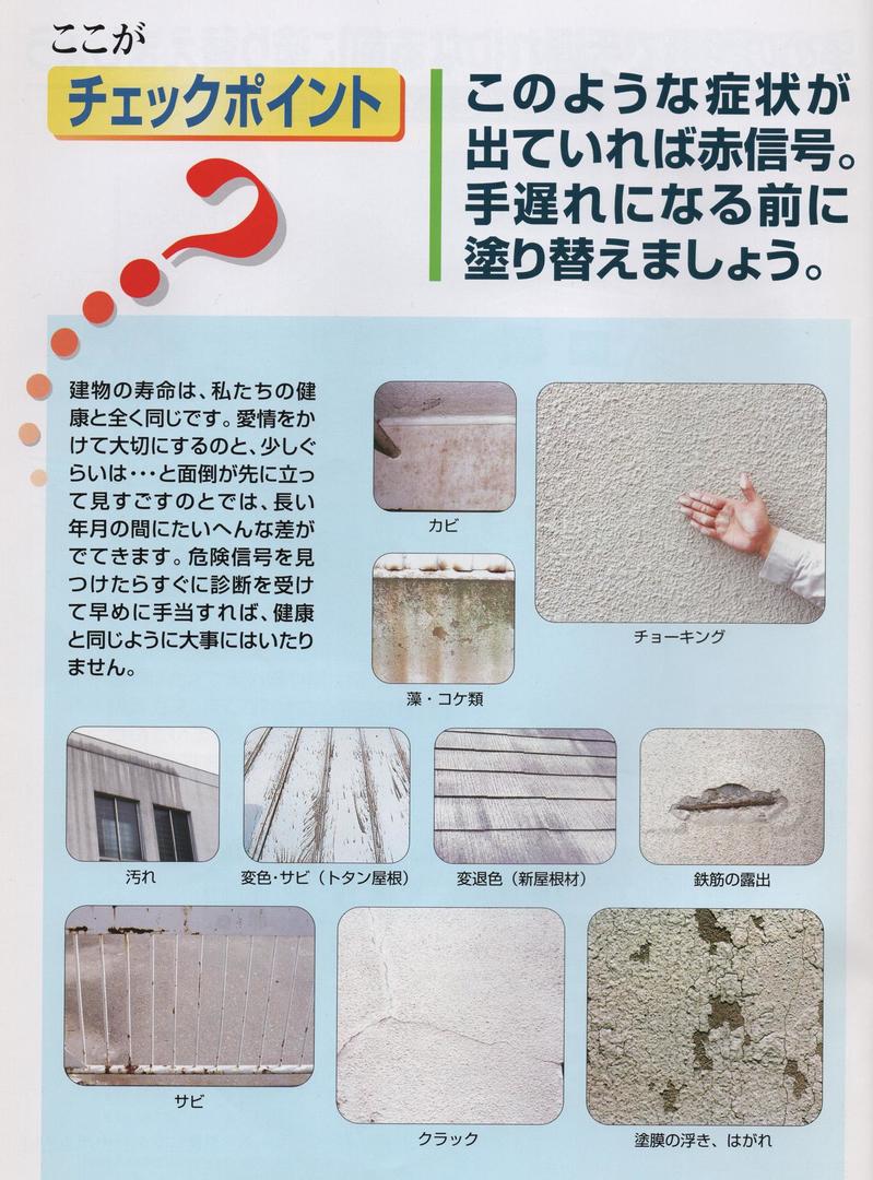 建物はたえず紫外線や酸性雨、潮風、排気ガス、ほこりなどにさらされて傷ついています。最初がいくら美しくても、手入れを怠ると取り返しがつかなくなります。そのような事がないよう、早めに対応して美しく塗り替えることが、同時に建物を保護して、寿命を延ばす秘訣です。